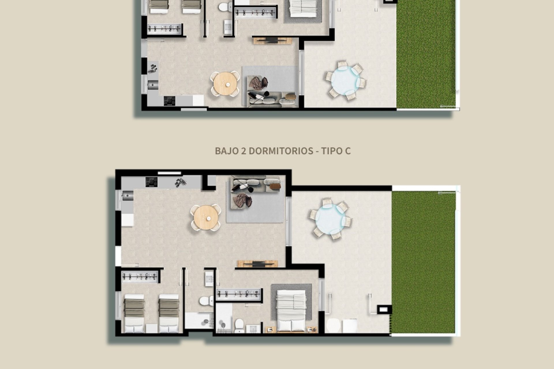 Die Wohnungen sind mit modernen Merkmalen ausgestattet, die ein hohes Maß an Komfort gewährleisten. Porzellanböden verleihen Eleganz und Langlebigkeit, während elektrische Rollläden und integrierte Geräte den Alltag erleichtern. Einbauschränke optimieren den Stauraum und sorgen für Ordnung und Funktionalität. Die Grundrissoptionen umfassen Wohnungen mit 2 und 3 Schlafzimmern sowie 2 oder 3 Bädern, die sich an unterschiedliche Familiengrößen und persönliche Vorlieben anpassen.