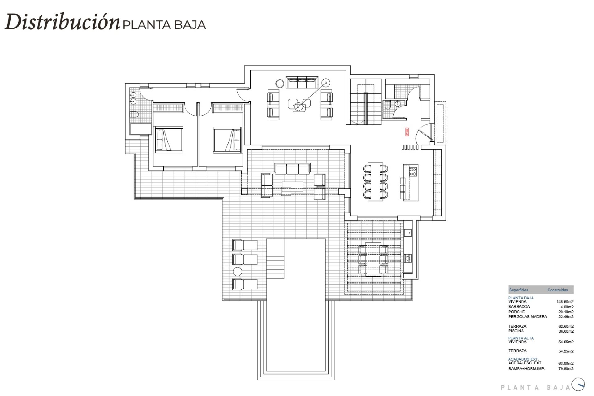 Das Innere der Villa ist mit einem Fokus auf Luxus und Funktionalität gestaltet. Die drei Schlafzimmer sind mit Einbauschränken ausgestattet, die reichlich Stauraum bieten. Die drei Badezimmer sorgen für Komfort und Privatsphäre für alle Familienmitglieder. Die Villa ist mit Fußbodenheizung ausgestattet, die in den kälteren Monaten eine warme und gemütliche Atmosphäre garantiert. Elektrische Rollläden verleihen einen modernen Touch und sind einfach zu bedienen. Darüber hinaus ist die Küche komplett mit hochwertigen Geräten ausgestattet, was die Zubereitung von Mahlzeiten zu einem angenehmen Erlebnis macht. Jedes Detail des Innenraums wurde sorgfältig bedacht, um ein Zuhause zu bieten, das Eleganz und Komfort vereint.