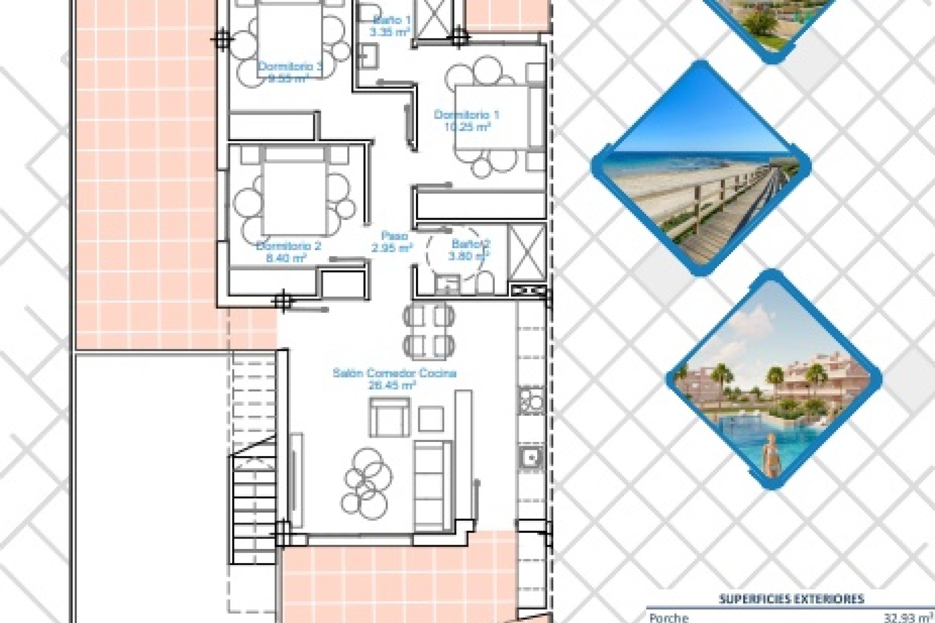 Das Innere der Bungalows ist mit einem Fokus auf Qualität und Komfort gestaltet. Die Böden aus Feinsteinzeug verleihen einen modernen und eleganten Touch, während elektrische Rollläden zusätzlichen Komfort bieten. Alle Wohnungen sind mit Haushaltsgeräten ausgestattet, was den Alltag von Anfang an erleichtert. Die Klimaanlage sorgt das ganze Jahr über für ein angenehmes Ambiente, und die Einbauschränke bieten effizienten Stauraum. Die Aufteilung umfasst drei Schlafzimmer und zwei Badezimmer, was einen großzügigen und funktionalen Raum für Familien oder Paare bietet.