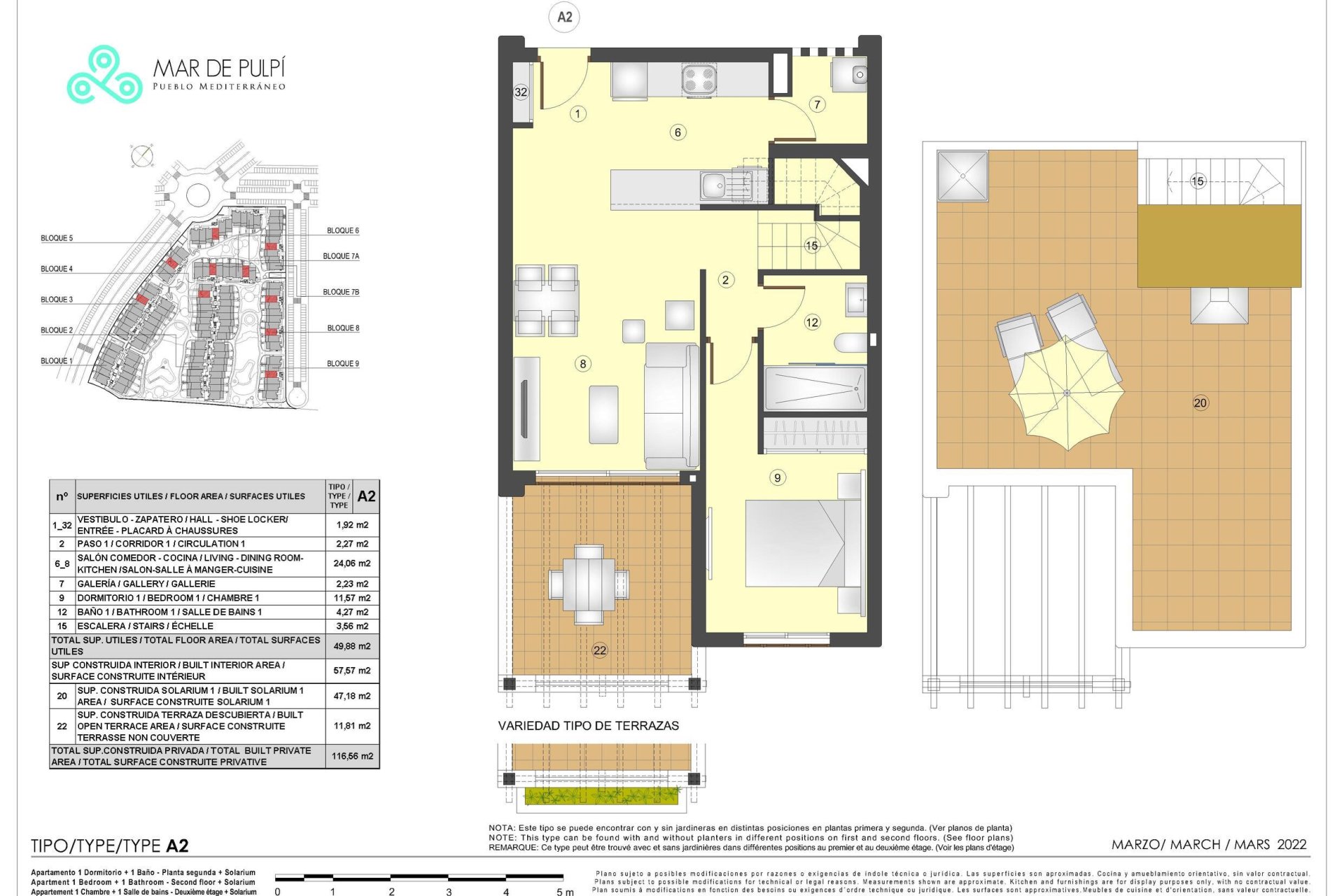 Situé dans la charmante localité de Pulpí, ce complexe résidentiel offre une variété d'options de logement qui s'adaptent à différents besoins et styles de vie. Avec un total de 157 propriétés, les résidents peuvent choisir entre appartements, bungalows et penthouses, chacun conçu pour maximiser le confort et la fonctionnalité. La proximité de la mer, à seulement 1 km, permet de profiter de vues sur la mer depuis de nombreux logements, créant une ambiance de tranquillité et de détente. Les options de distribution incluent des logements de 1, 2 et 3 chambres, avec 1 ou 2 salles de bains, offrant une flexibilité pour les familles de différentes tailles. L'emplacement stratégique à Pulpí garantit un accès facile aux services locaux et aux activités récréatives, faisant de ce résidentiel une option idéale pour ceux qui recherchent un équilibre entre confort et qualité de vie.