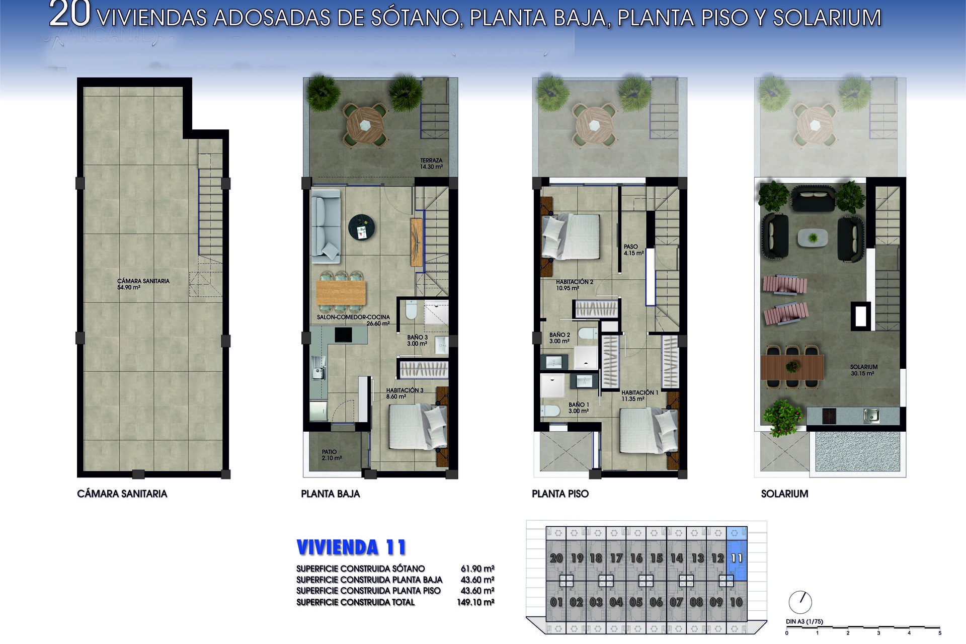 Les extérieurs de ces maisons mitoyennes à Dolores sont pensés pour maximiser le plaisir du climat méditerranéen. Chaque logement dispose d'une terrasse privée, un espace parfait pour profiter de moments en plein air, que ce soit pour se détendre, partager avec des amis ou simplement profiter d'un dîner sous les étoiles. De plus, le solarium est une caractéristique remarquable, offrant un espace supplémentaire pour bronzer ou créer un petit jardin urbain. L'architecture extérieure s'intègre harmonieusement à l'environnement, offrant un design moderne qui complète la beauté naturelle de la région.