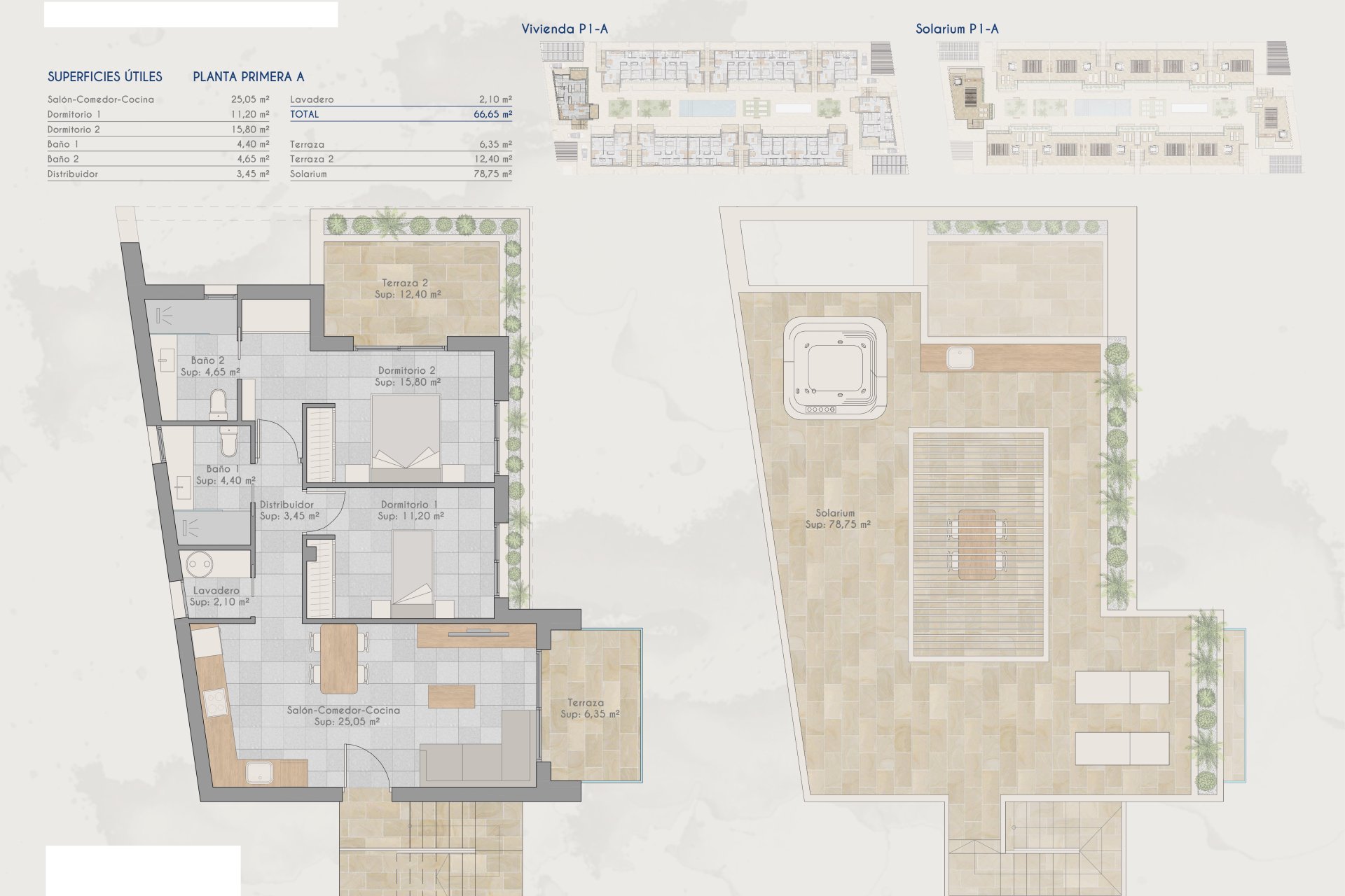 Les extérieurs de ces logements à Torre-Pacheco sont conçus pour profiter du climat méditerranéen. Chaque propriété dispose d'une terrasse privée, parfaite pour se détendre en plein air. De plus, les logements incluent un solarium, offrant un espace supplémentaire pour bronzer ou profiter des vues environnantes. La présence d'une pergola ajoute une touche d'élégance et de fonctionnalité, fournissant ombre et style aux espaces extérieurs.