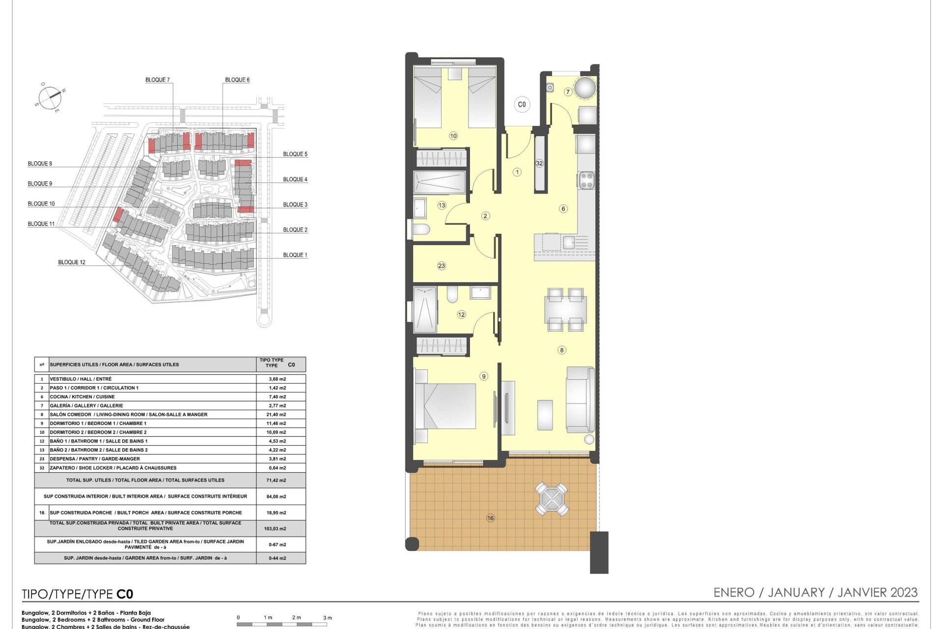 Located in the charming town of Pulpí, this residential complex offers a selection of 103 properties designed to meet the needs of those seeking a home in a privileged environment. Housing options include high-bungalows and low-bungalows, each carefully designed to offer comfort and functionality. The proximity to the sea, just 1 km away, allows for the enjoyment of the sea breeze and a relaxed, Mediterranean lifestyle. The properties are equipped with modern features such as air conditioning, underfloor heating, and electric shutters, ensuring a comfortable environment year-round. Additionally, all homes are fully furnished and equipped with high-quality appliances, facilitating a hassle-free move. Built-in wardrobes offer efficient storage, while the ability to charge electric vehicles in the communal garage adds a touch of modernity and sustainability.