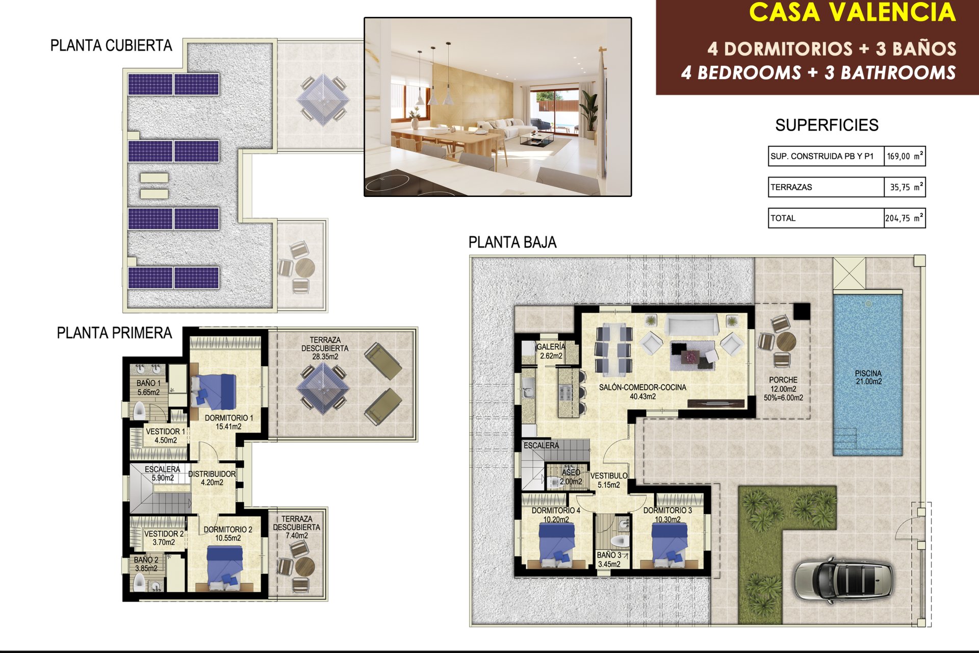 Inside, the villas are equipped with porcelain tile floors, offering durability and an elegant finish. The properties feature three bedrooms and three bathrooms, providing a spacious and comfortable space for the whole family. Electric shutters and included appliances add a touch of modernity and convenience. Additionally, built-in wardrobes and pre-installed air conditioning ensure optimal comfort year-round.