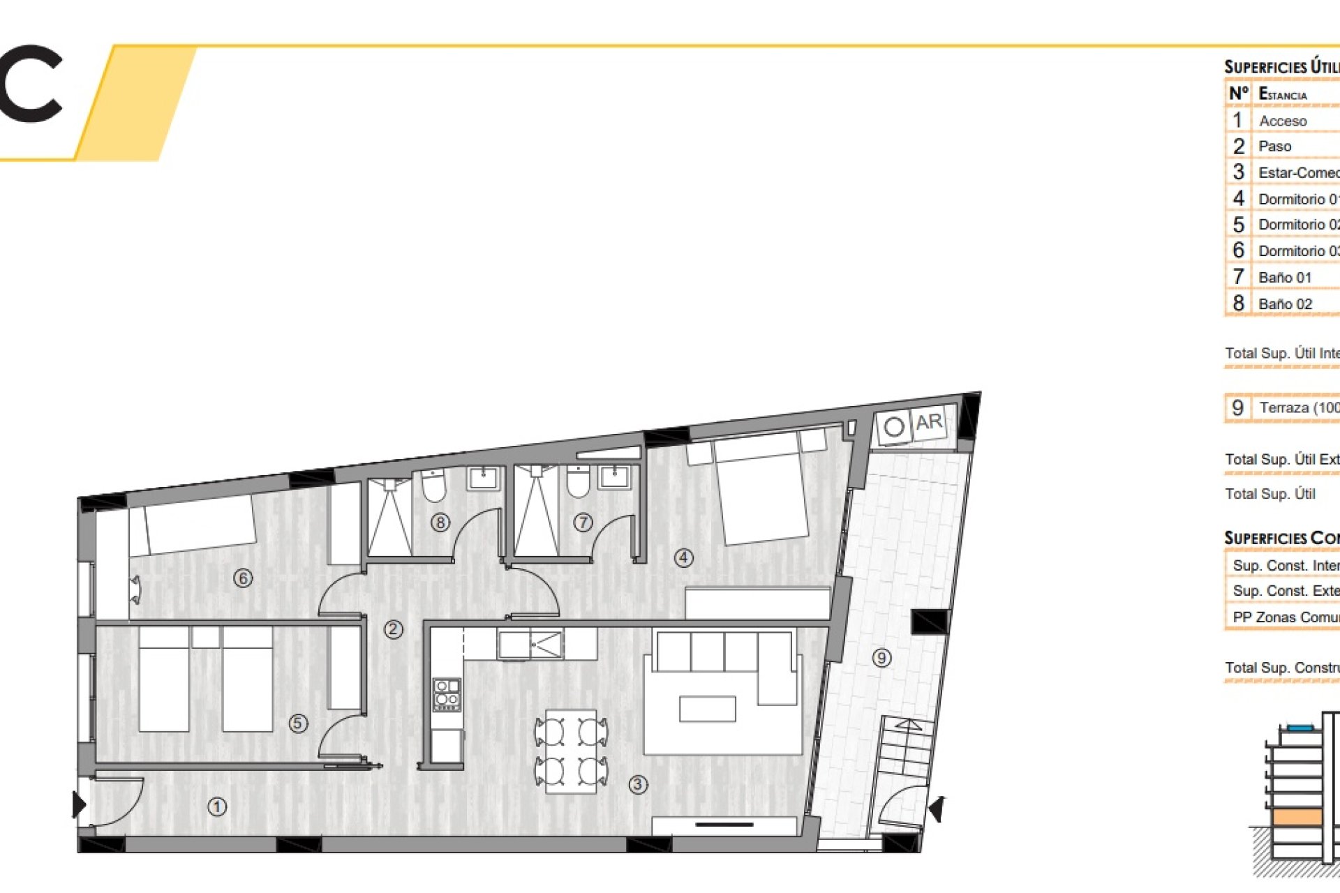 Inside, the penthouses stand out for their modern and functional design. Porcelain tile floors add a touch of elegance and are easy to maintain. The layout includes options for 2 or 3 bedrooms, catering to different family needs, and 2 bathrooms that ensure the comfort of all residents. Built-in wardrobes offer efficient storage space, while the inclusion of appliances in the kitchen facilitates daily life. The option of an optional garage adds a personal touch according to each buyer's preferences.