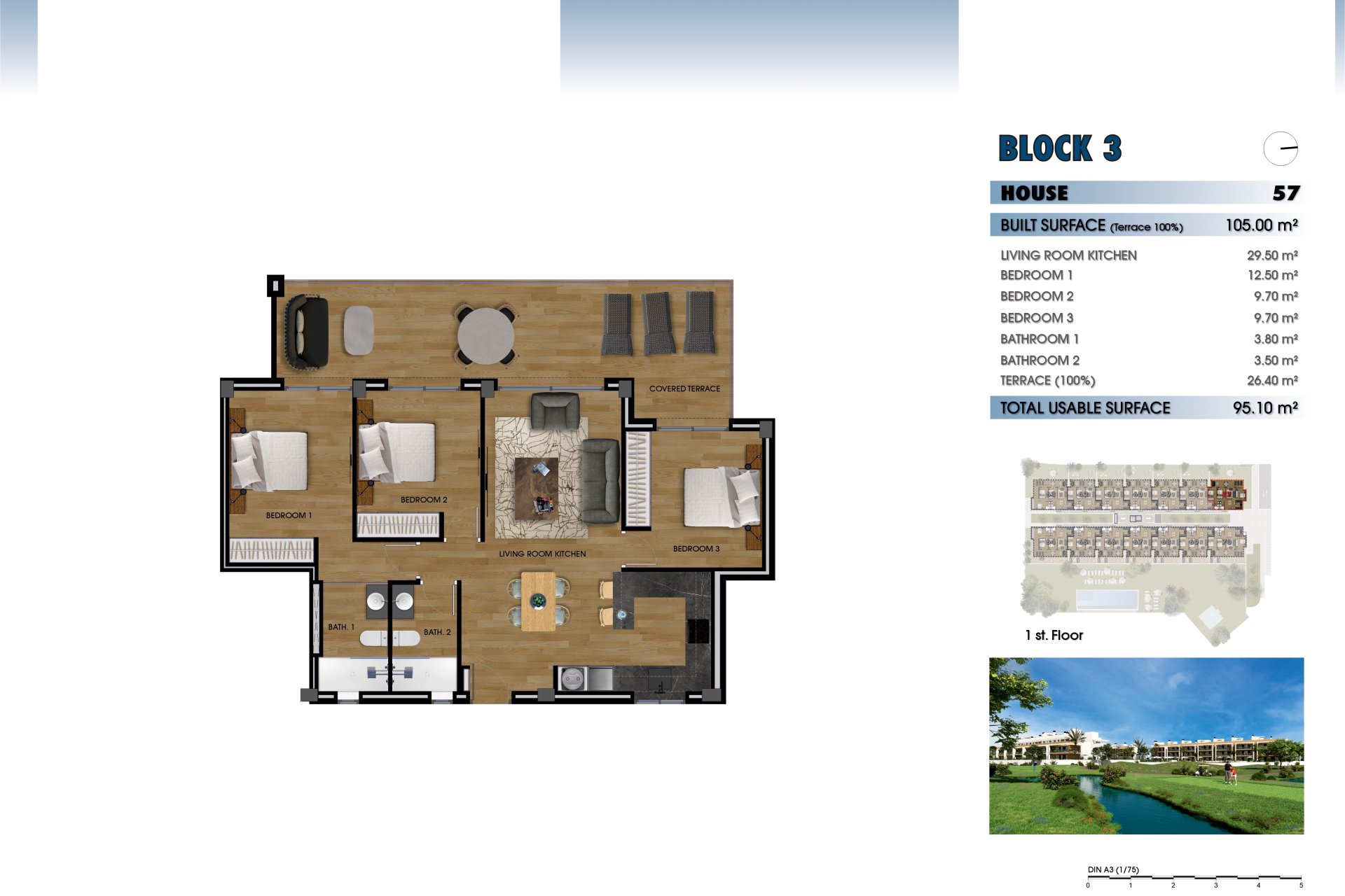 The interior of the homes is designed to offer maximum comfort and functionality. Layout options include homes with 2 and 3 bedrooms, all with 2 bathrooms, ensuring ample space for families of different sizes. The kitchens are equipped with modern appliances, and the air conditioning system, along with additional pre-installation, ensures a pleasant environment throughout the year. Electric shutters and the video intercom add a touch of modernity and security. Built-in wardrobes offer efficient storage solutions, keeping spaces tidy and clutter-free.