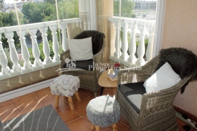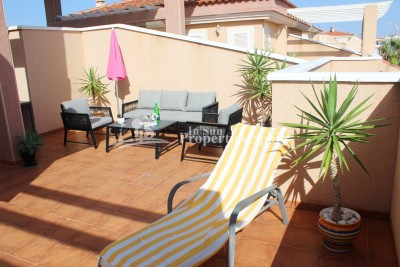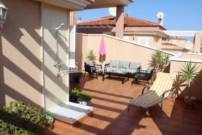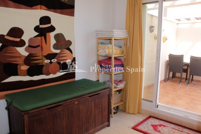 This beautifully presented, fully furnished south east top-floor apartment is perfectly situated in the highly sought-after Urbanisation Zeniamar in Playa Flamenca, offering breathtaking sea views and a superb Mediterranean lifestyle. The property features 2 spacious bedrooms, 2 bathroom both with shower, and a bright, open-plan living area, kitchen with a seperate utiliy area and access to a cosy glazed in terrace with sea view. From the main floor, an internal staircase leads to an upper level currently arranged as a home office or potential third bedroom, alongside a second bathroom and access to a large private rooftop solarium with a shower – the ideal place to enjoy the sunshine all day and take in the spectacular panoramic sea views. Additional features include:Fully furnished and move-in ready, fitted with Air conditioning, Underground parking and storage room (available at an additional cost), Beautifully maintained communal gardens, Large swimming pool, gym, and sauna within the community. Located in a prime central position, Zeniamar is one of the most desirable residential complexes on the Orihuela Costa, built by the renowned developer TM Group, known for its exceptional design and build quality. The complex is within walking distance to the Citrus Shopping Centre, with international supermarkets, cafés (including the Scandinavian supermarket), and just a 10-minute drive to La Zenia Boulevard, the largest shopping mall in Alicante province with over 150 shops, restaurants, and entertainment venues. The golden sandy beaches of Playa Flamenca are only 2 km away, offering crystal-clear waters and a range of coastal activities. The area is conveniently located 40 minutes from Alicante Airport, making it ideal as both a holiday home and a permanent residence. Whether you’re looking to relax in the sun, enjoy local cuisine, or explore the surrounding golf courses and coastline, this apartment provides the perfect combination of comfort, convenience, and stunning sea views. A true gem on the Orihuela Costa — a property not to be missed!
