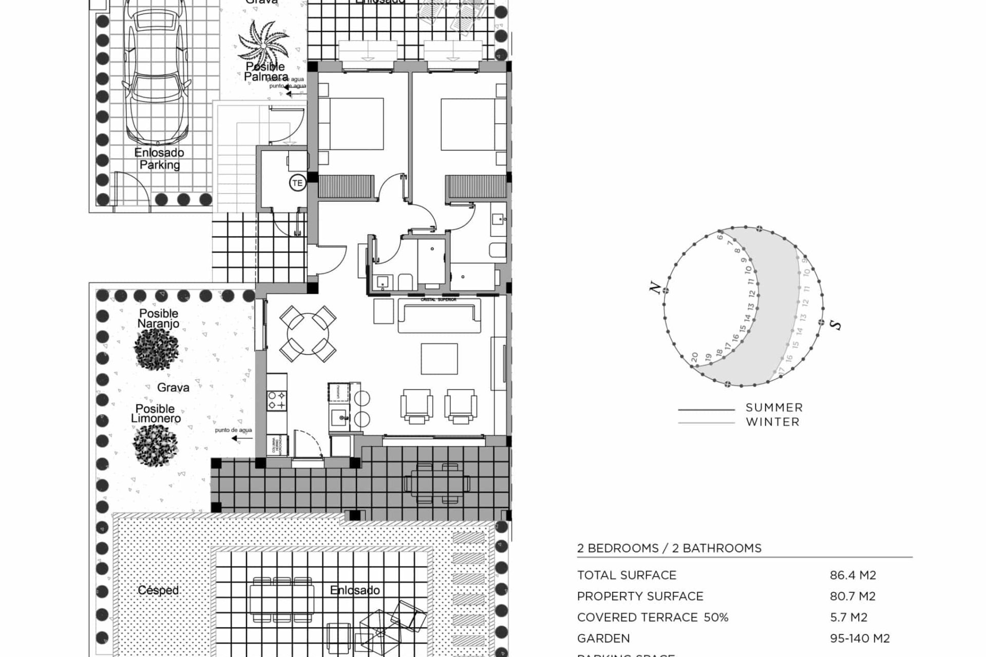 Utomhusområdena för dessa bungalows är utformade för att maximera njutningen av medelhavsklimatet. Varje fastighet har en privat trädgård, perfekt för avkoppling eller utomhusaktiviteter. Terrasserna erbjuder extra utrymme för underhållning eller bara för att njuta av utsikten. Dessutom ger ett solarium en idealisk plats för solbad i total avskildhet. Inkluderingen av en pergola tillför en touch av elegans och funktionalitet, vilket gör det möjligt att njuta av utomhusutrymmet när som helst på dagen.