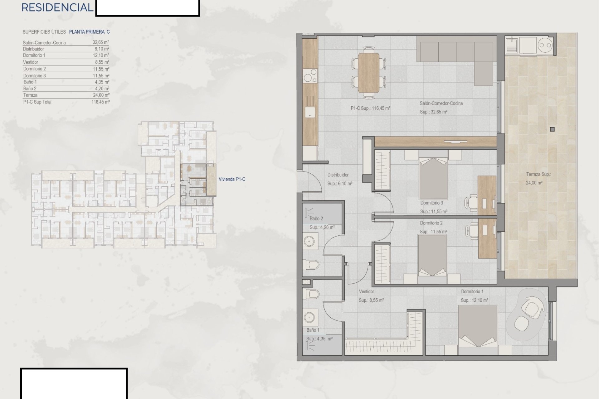 Utomhusområdena i denna bostadsrätt i Torre-Pacheco är utformade för att maximera njutningen av det medelhavsklimatet. Alla fastigheter har terrasser, perfekta för att koppla av utomhus och njuta av utsikten över omgivningen. Dessutom har takvåningarna solarium, vilket ger extra utrymme för fritid och avkoppling. Samhället erbjuder också tillgång till ett garage, vilket säkerställer bekvämlighet och säkerhet för boendes fordon. Närheten till flygplatsen, endast 25 km bort, tillför ett betydande värde för dem som reser ofta.